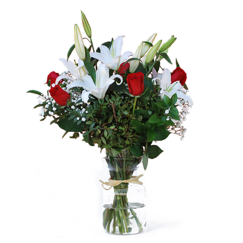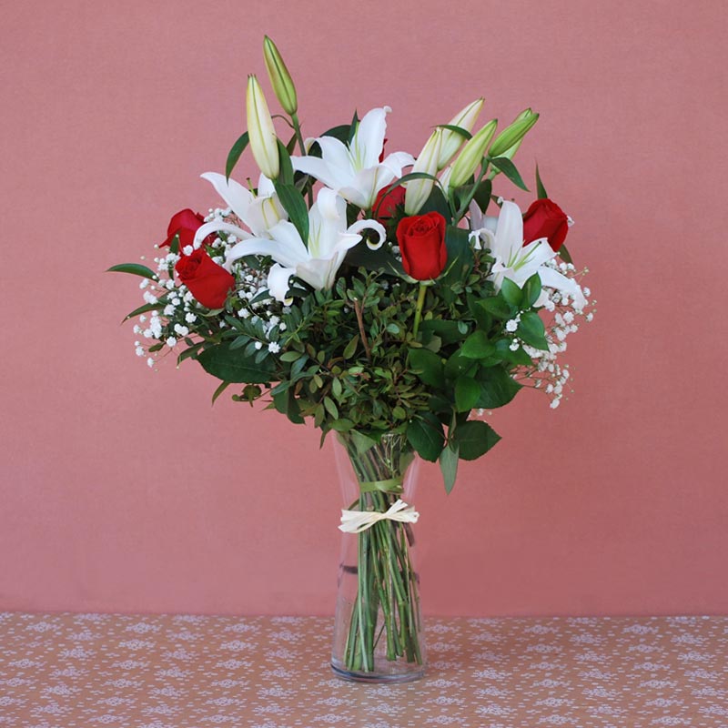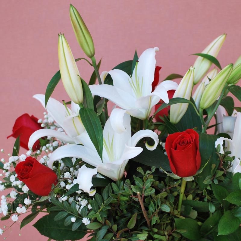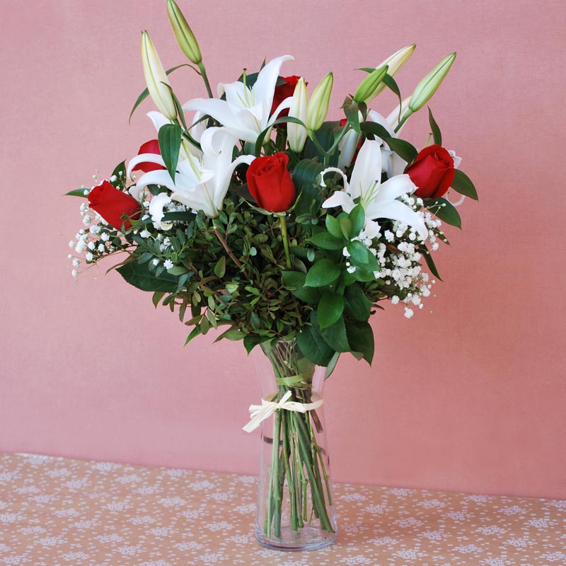 El ramo de rosas rojas y varas de lilium Loreto es el clásico entre los clásicos. Tiene como peculiaridad que, además de la belleza de las rosas rojas, tiene el penetrante aroma del lilium, una flor duradera y versátil.